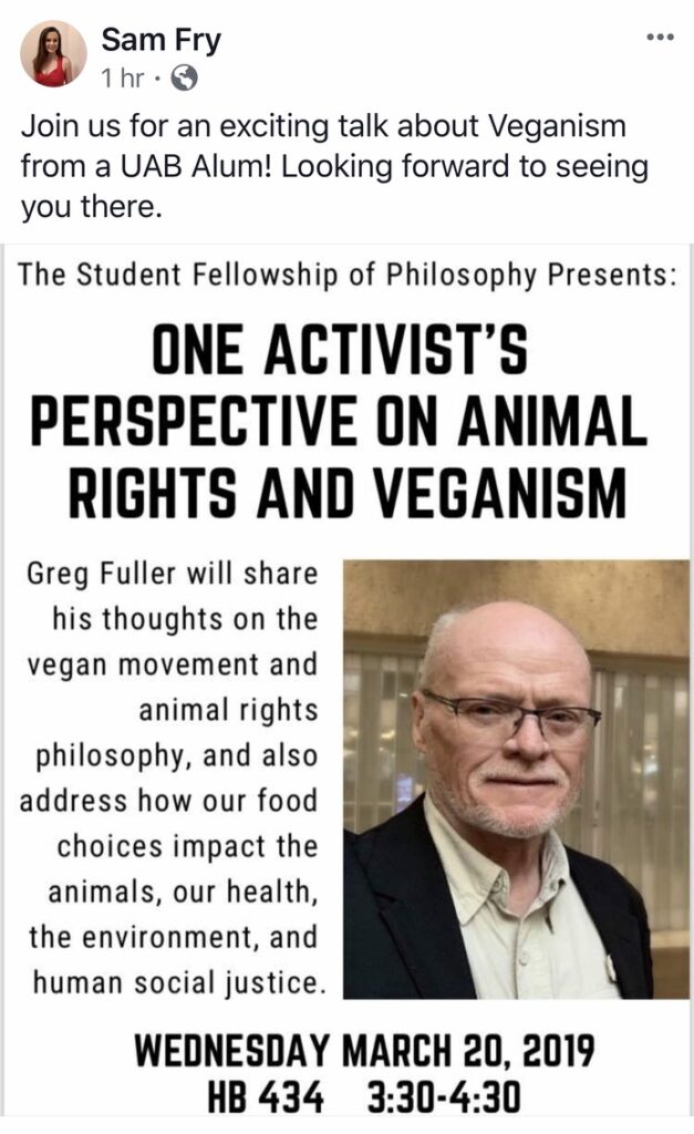Starting in 2014, Greg devoted much of his time to traveling and working alongside animal rights organizations across the U.S. His activism has included street outreach, public speaking, tabling, leafleting, marches, protests, banner drops, and other forms of advocacy.